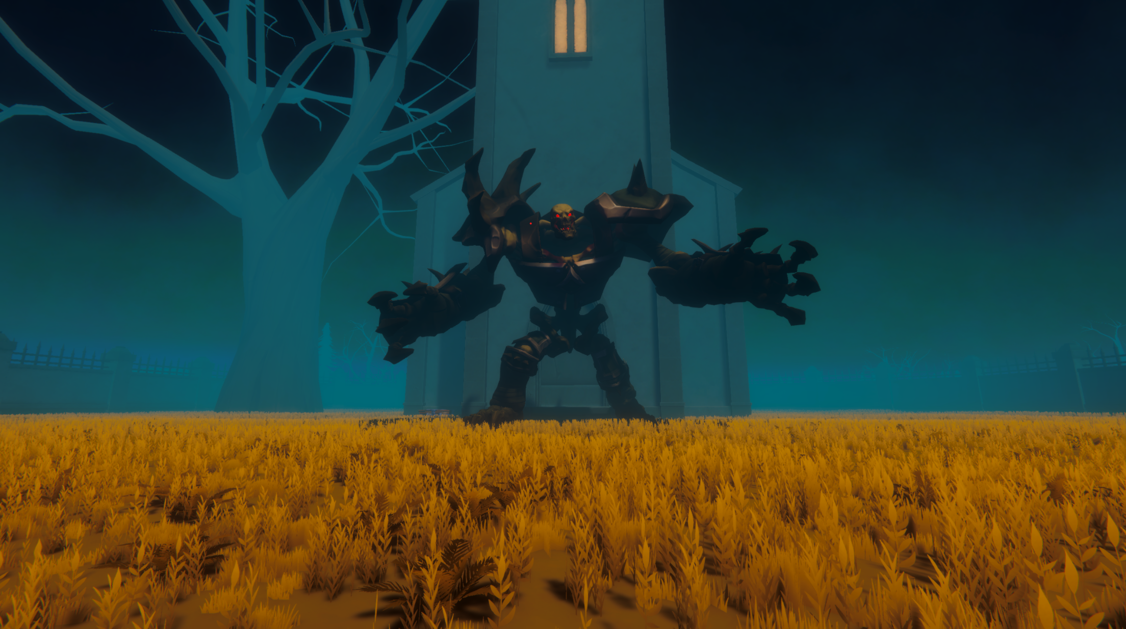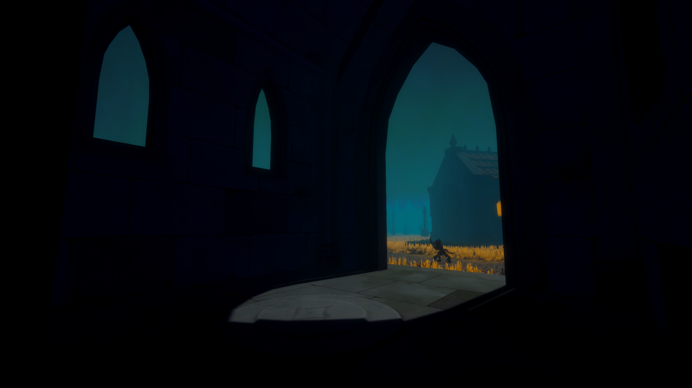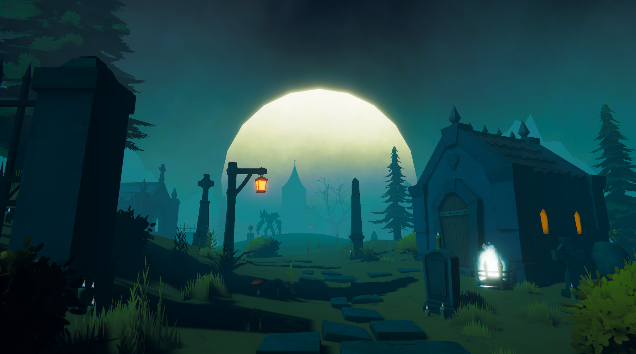 The graveyard at moonrise. Something waits at the chapel door.