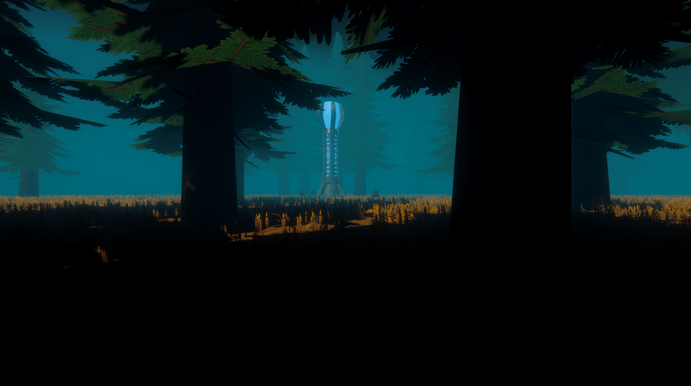 A structure of unknown origin glows through the treeline. No faction claims it.